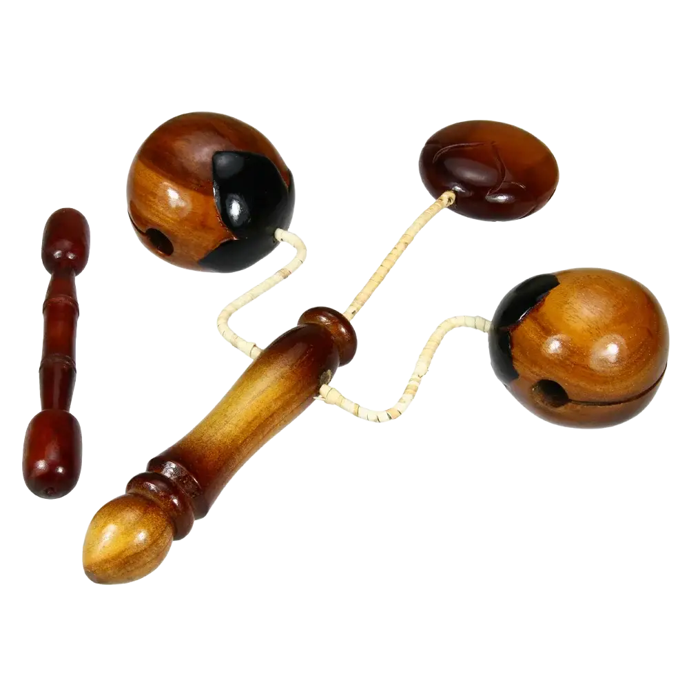 This percussion instrument combines two wooden temple blocks with a slit hardwood disc, creating a single unified tool with three distinct striking surfaces. The construction yields clear, articulated tones across its playing areas, with natural tonal variation that responds to where and how you strike it.