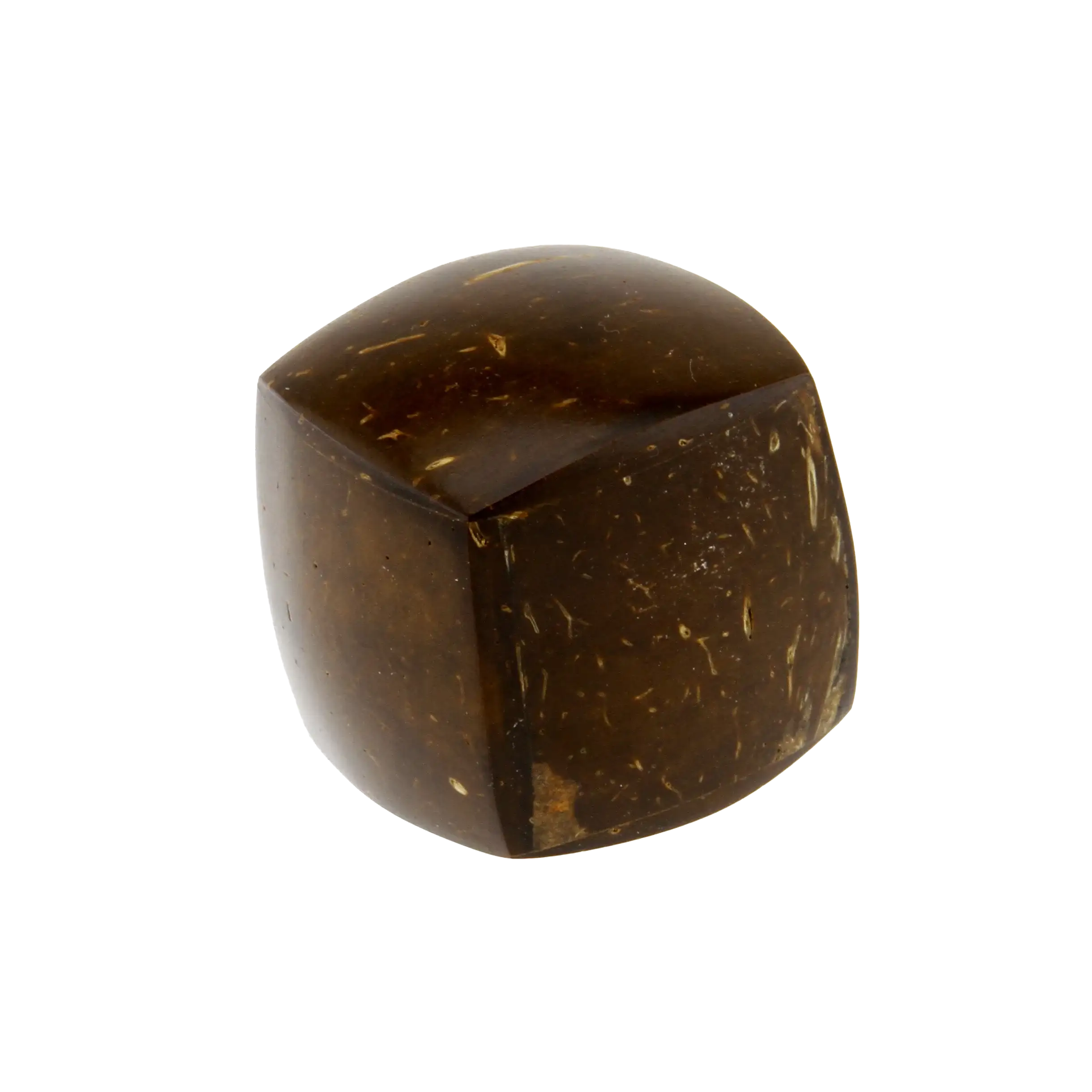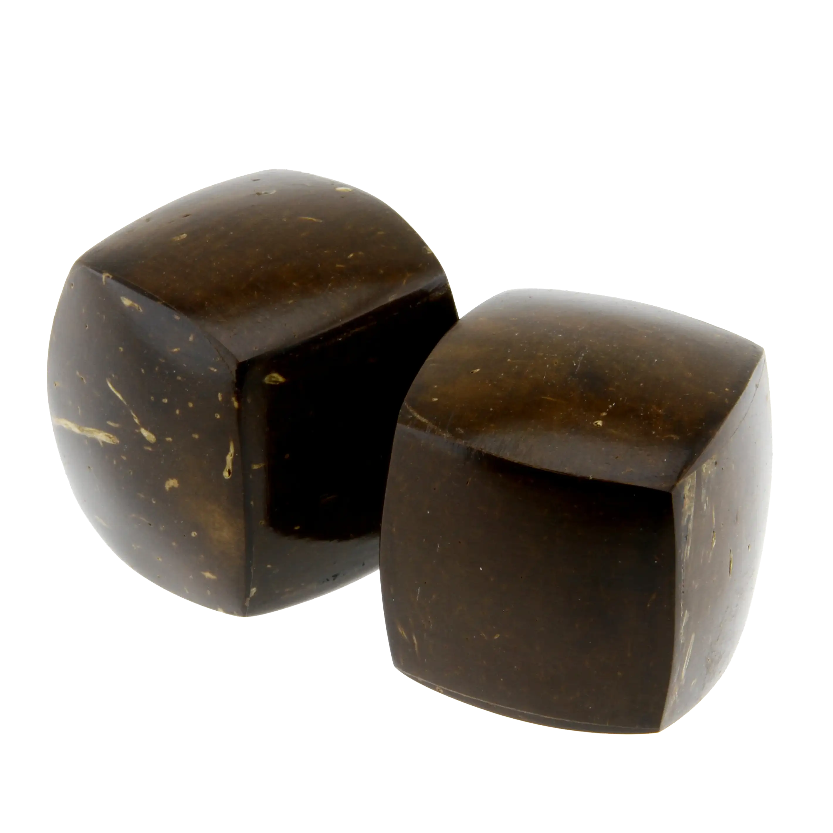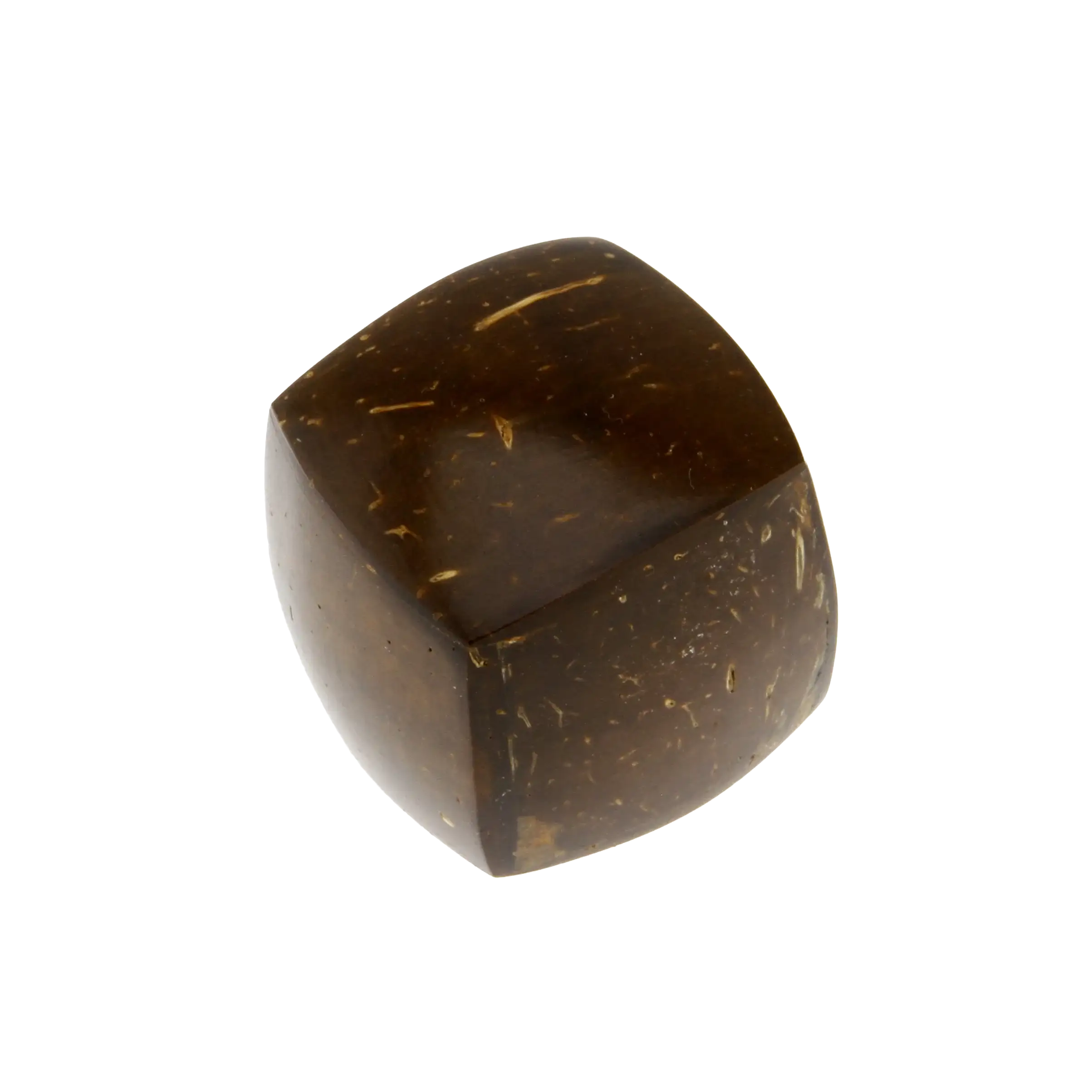 The shaker is fashioned from the hard shell of the coconut, a material chosen for its density and natural resonance. Steel balls inside the hollow chamber create the primary sound source. The slightly rounded surfaces of the cube provide comfort during extended play and contribute to the instrument's tactile quality.