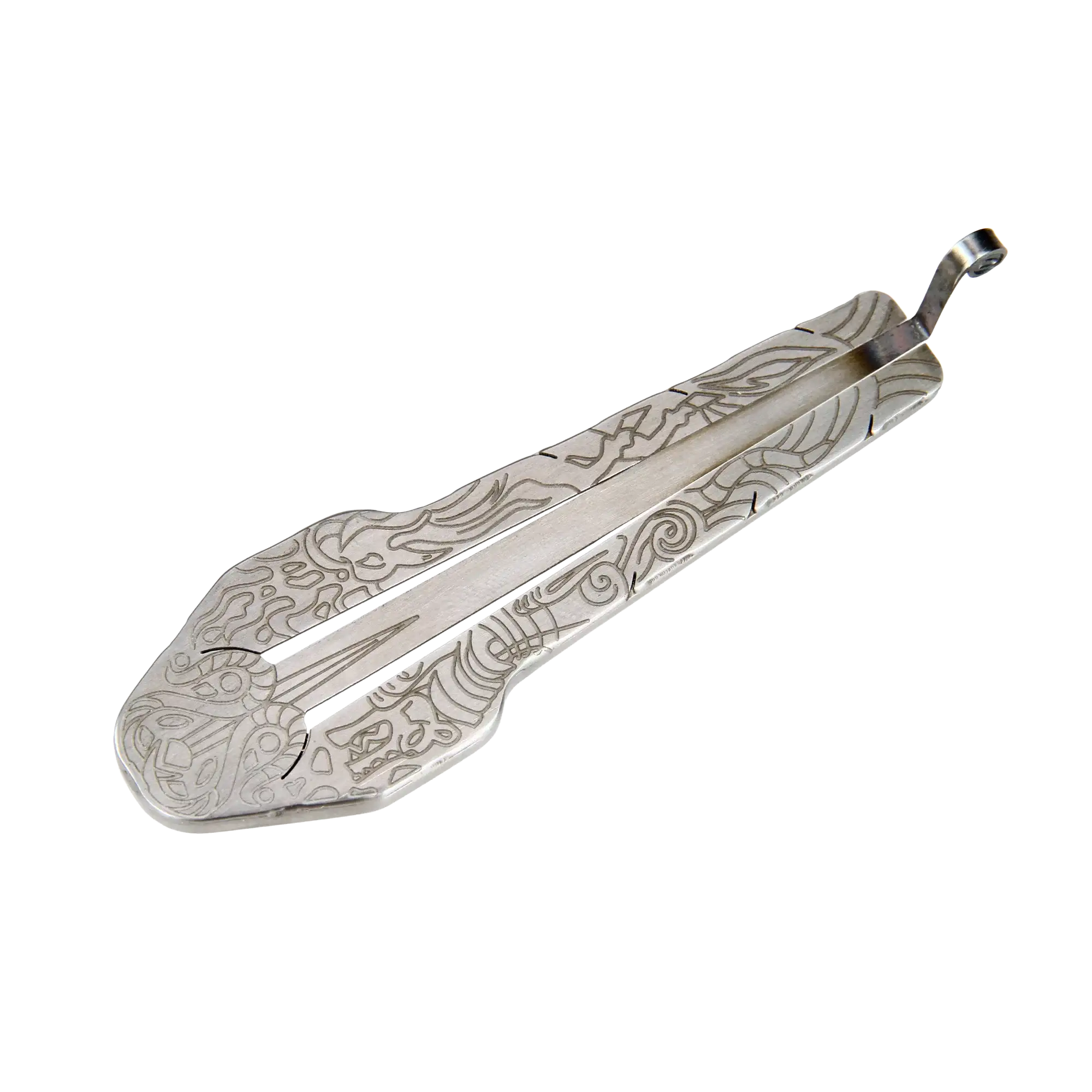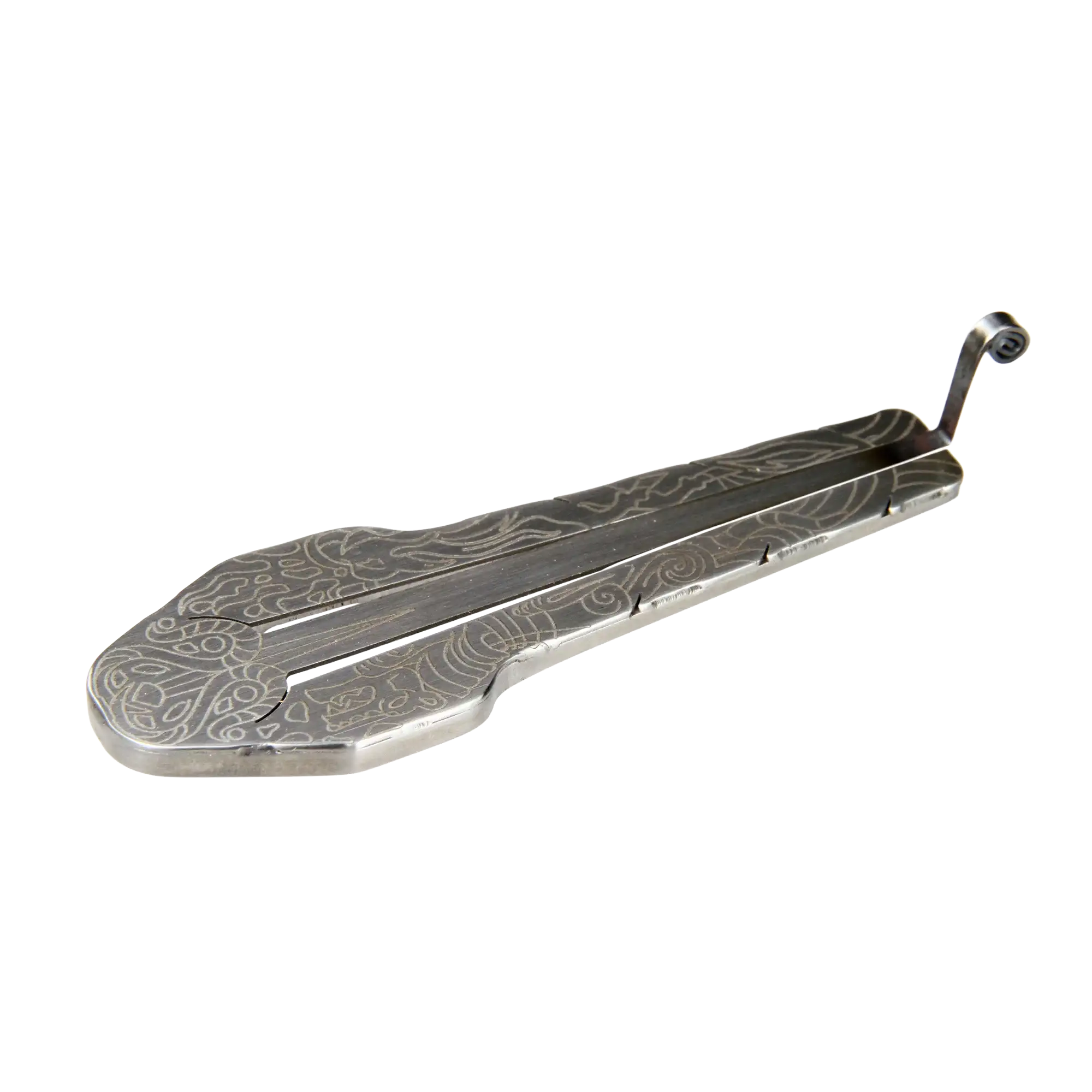 Guimbarde Vargan Glazyrin Skiff — A Russian vargan crafted by master maker Dmitry Glazyrin, featuring a single-piece carbon steel frame and tongue that deliver clarity and minimal play gap. The decorated tongue carries laser-etched mythological motifs and a hummingbird design, while the instrument produces a bright, balanced tone rich in harmonics across tunings from C#2 to F2. Compact at 8.5 × 2.5 cm and weighing just 25 g, it suits both traditional folk performance and contemporary experimental work. Includes transport blocks and quick-start guide.